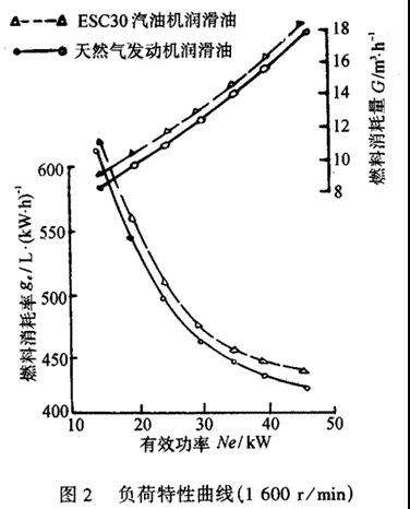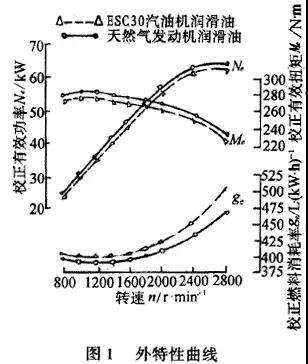 在CA6102天然气发动机台架上,对使用天然气发动机润滑油和使用ESC30汽油机润滑油进行了对比试验,外特性和负荷特性曲线如图1、图2所示。试验中所用燃料均为天然气,燃料消耗量以天然气在标准状况下体积计算。从图1中可以看出,与使用ESC30汽油机润滑油相比,使用天然气发动机润滑油可以增大发动机的功率和扭矩,降低燃料消耗率10%左右。